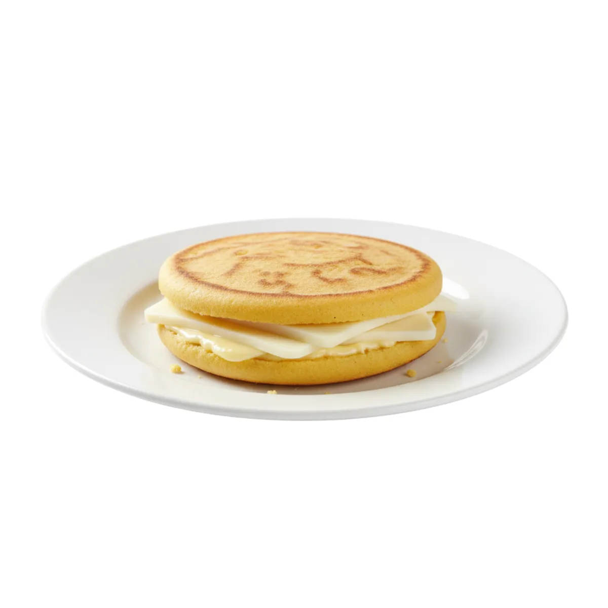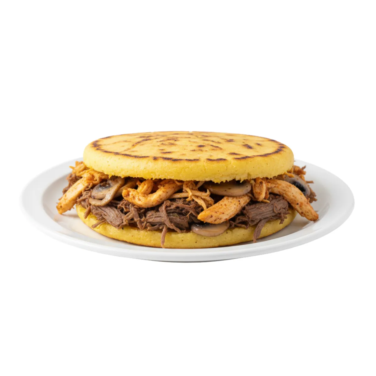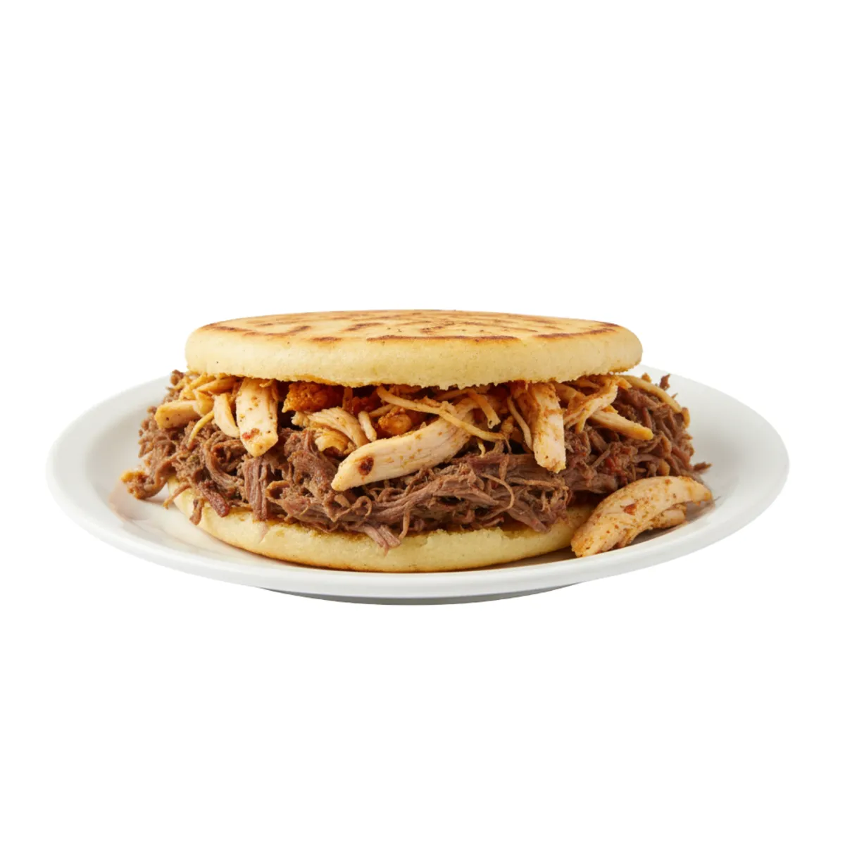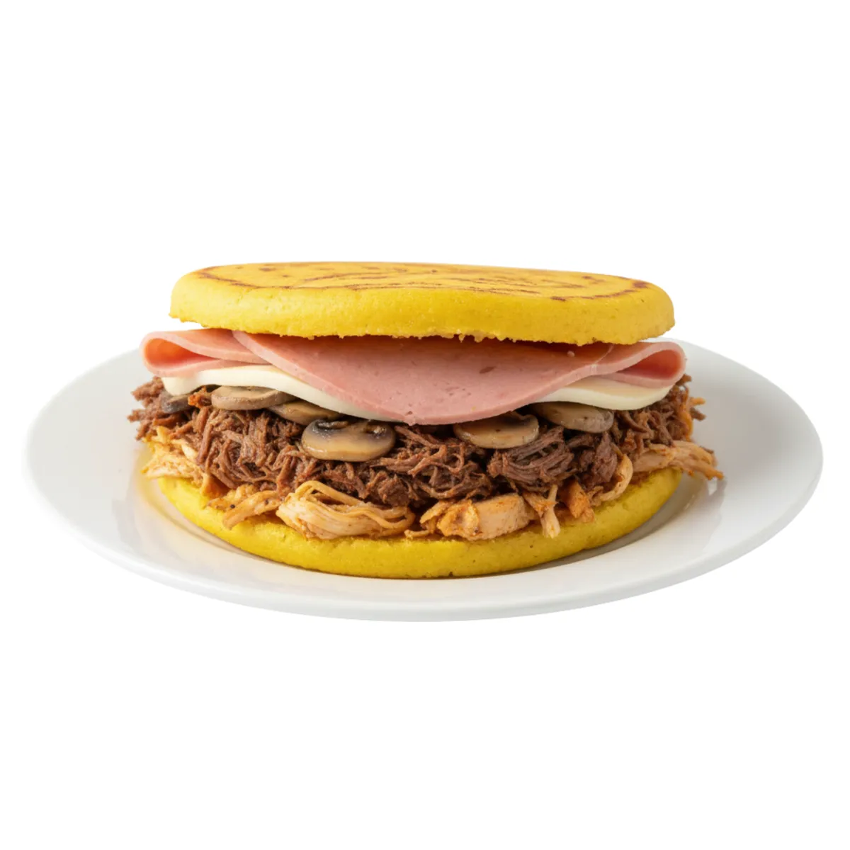 Arepa rellena con mantequilla, jamón, queso y mortadela