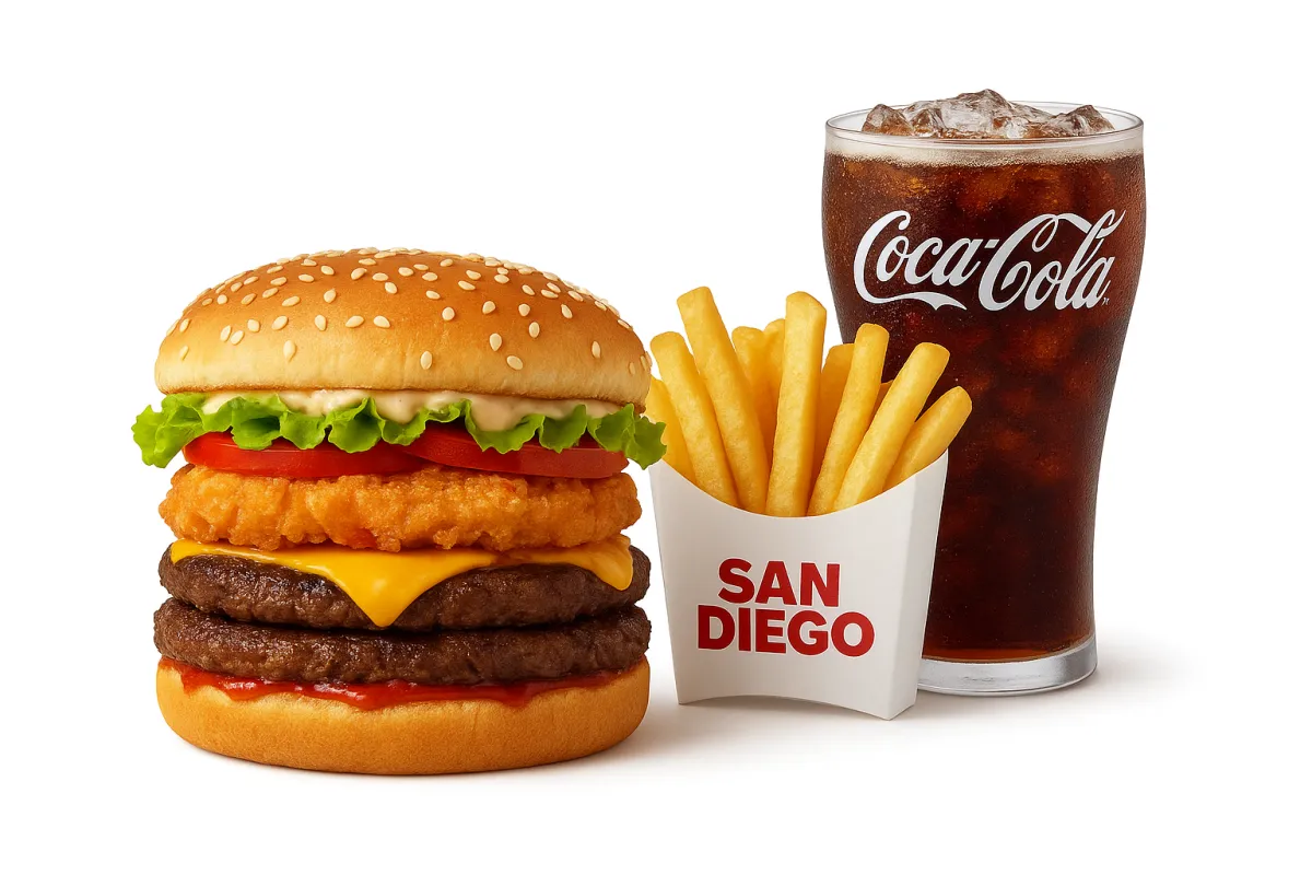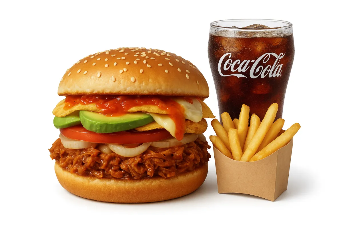 2 carnes de res, 1 de pollo, pan, lechuga, tomate, queso y salsas