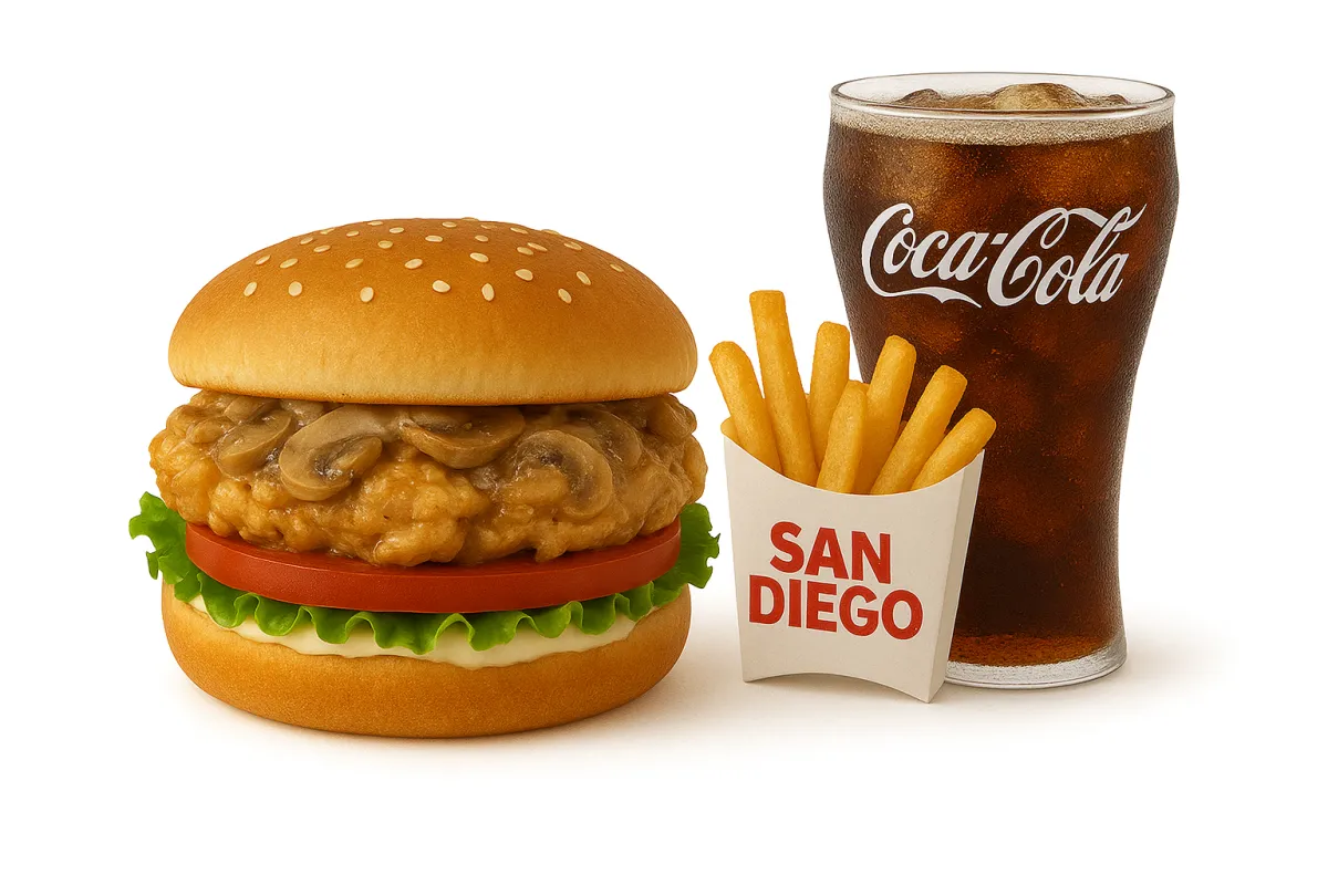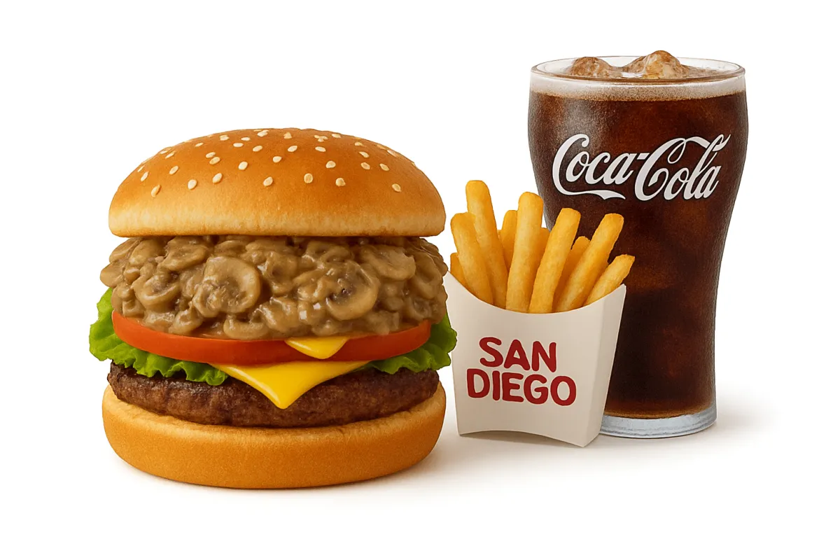 Carne o pollo, pan, lechuga, tomate, guiso de champiñones con cebolla, queso, huevos de codorniz y salsas