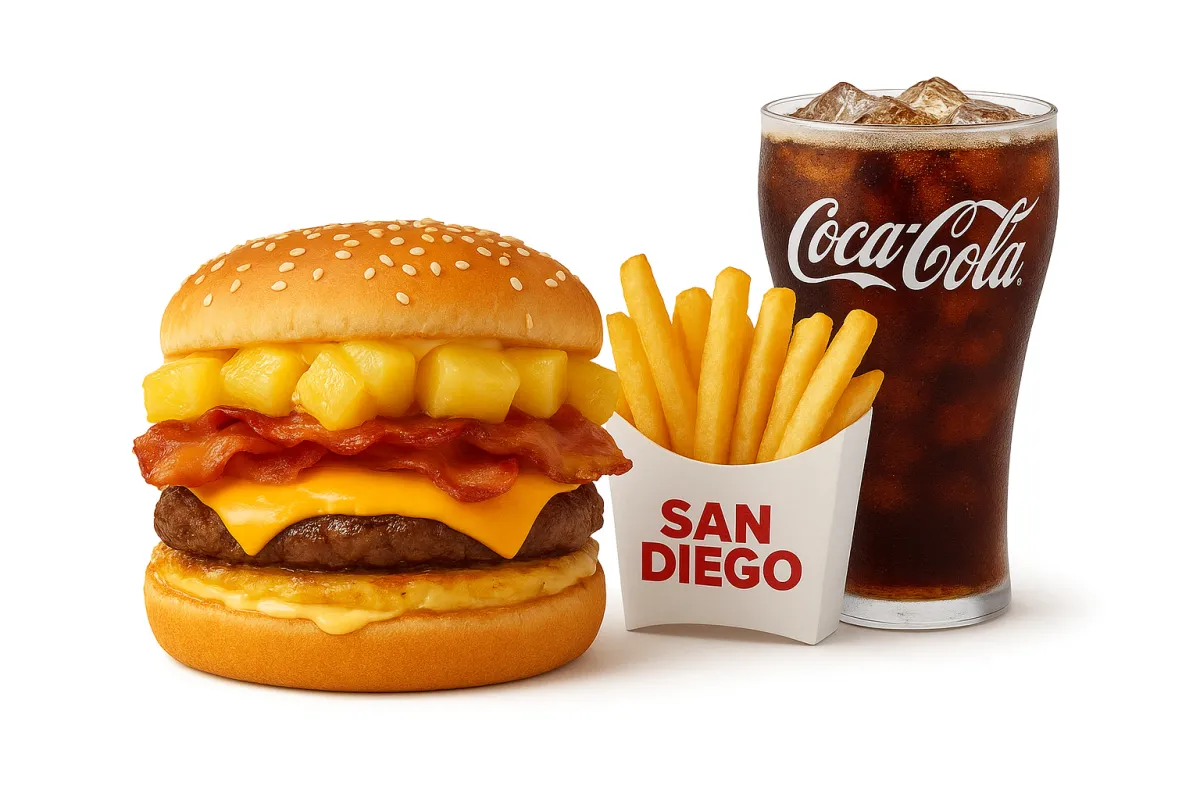 Carne o pollo, pan, recorte de papa, tocineta, queso, piña en trozos y salsa de piña