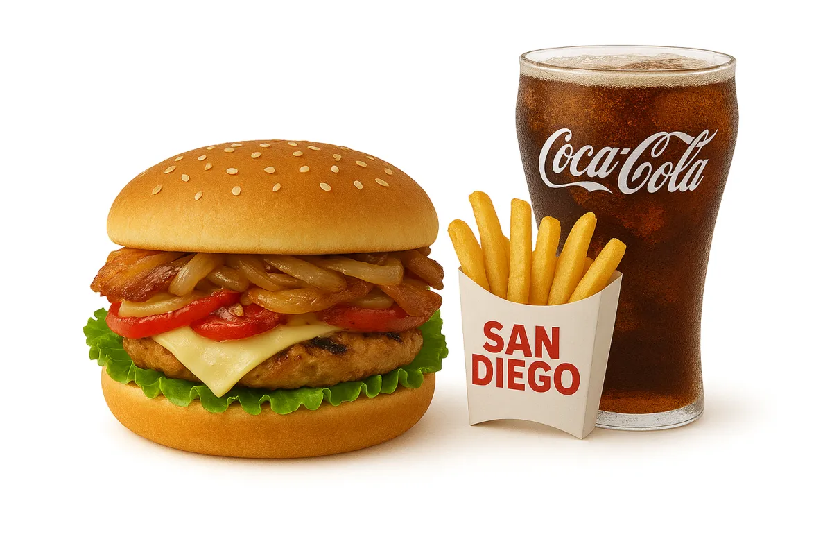 Carne o pollo, pimentón, pan, cebolla, tocineta, lechuga, tomate, queso y salsas.
