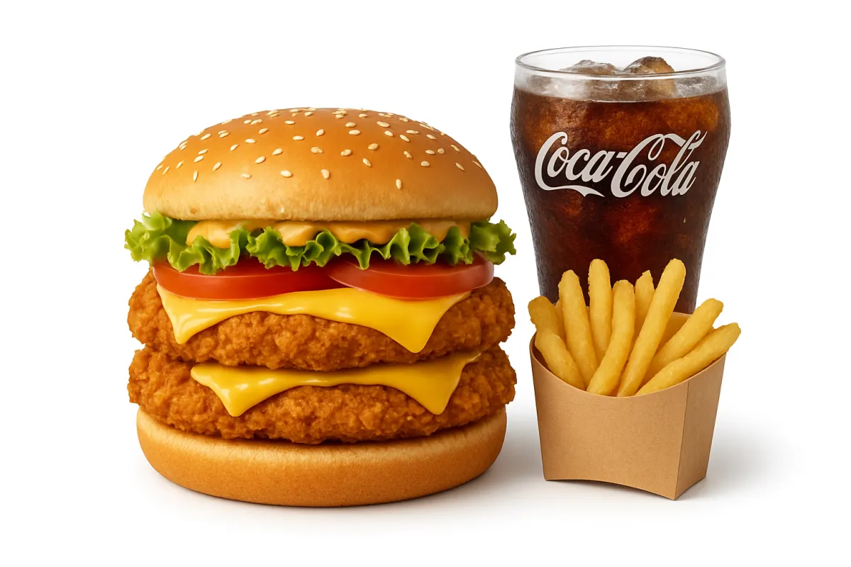 2 Carnes o 2 Pollos apanados, pan, lechuga, tomate, queso, salsas