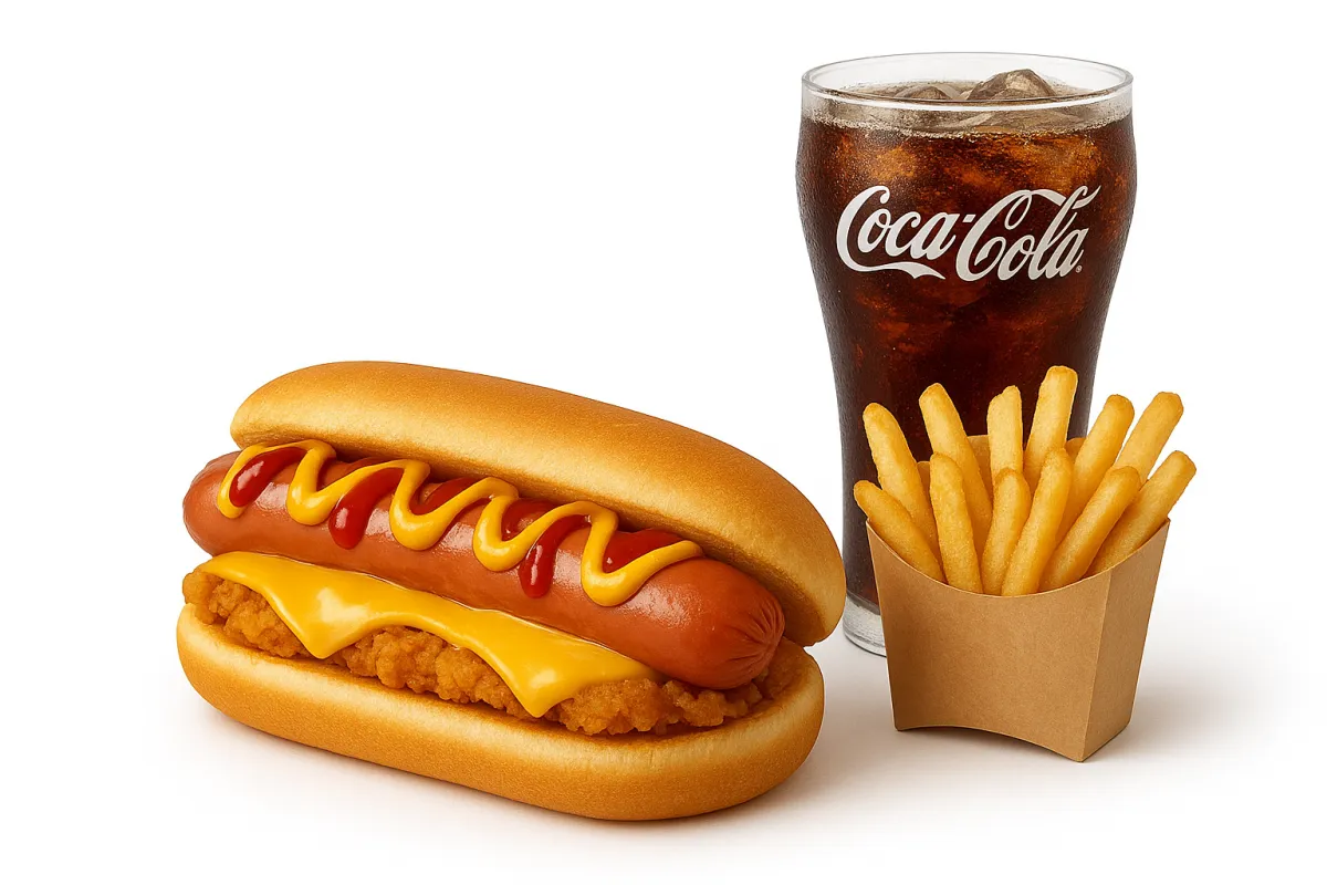 Pan, salchicha americana, recorte de papa, queso y salsas.