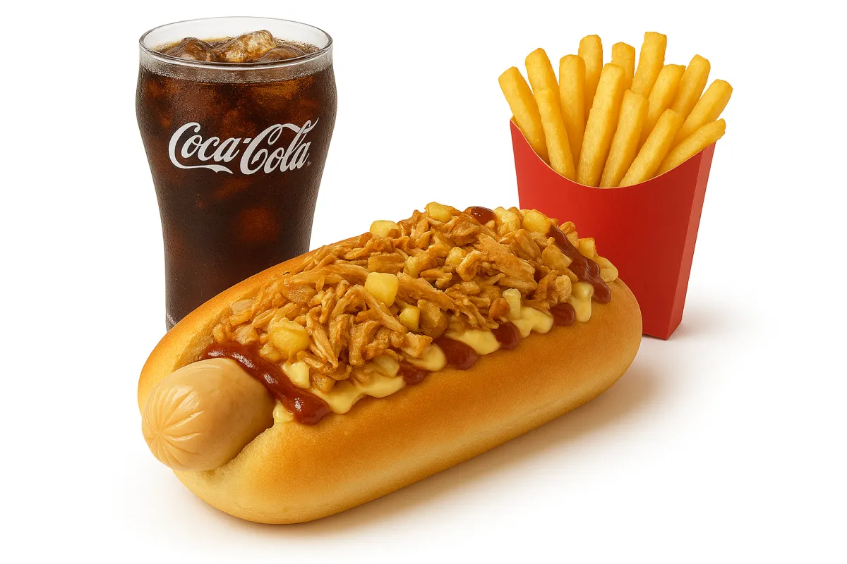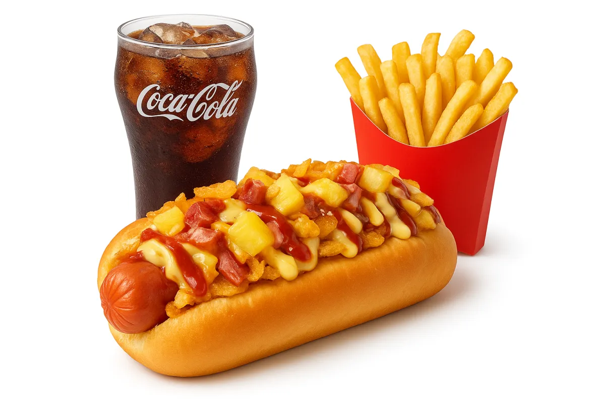 Pan, salchicha americana, recorte de papa, maíz, carne desmechada, cebolla, tocineta, queso y salsas.