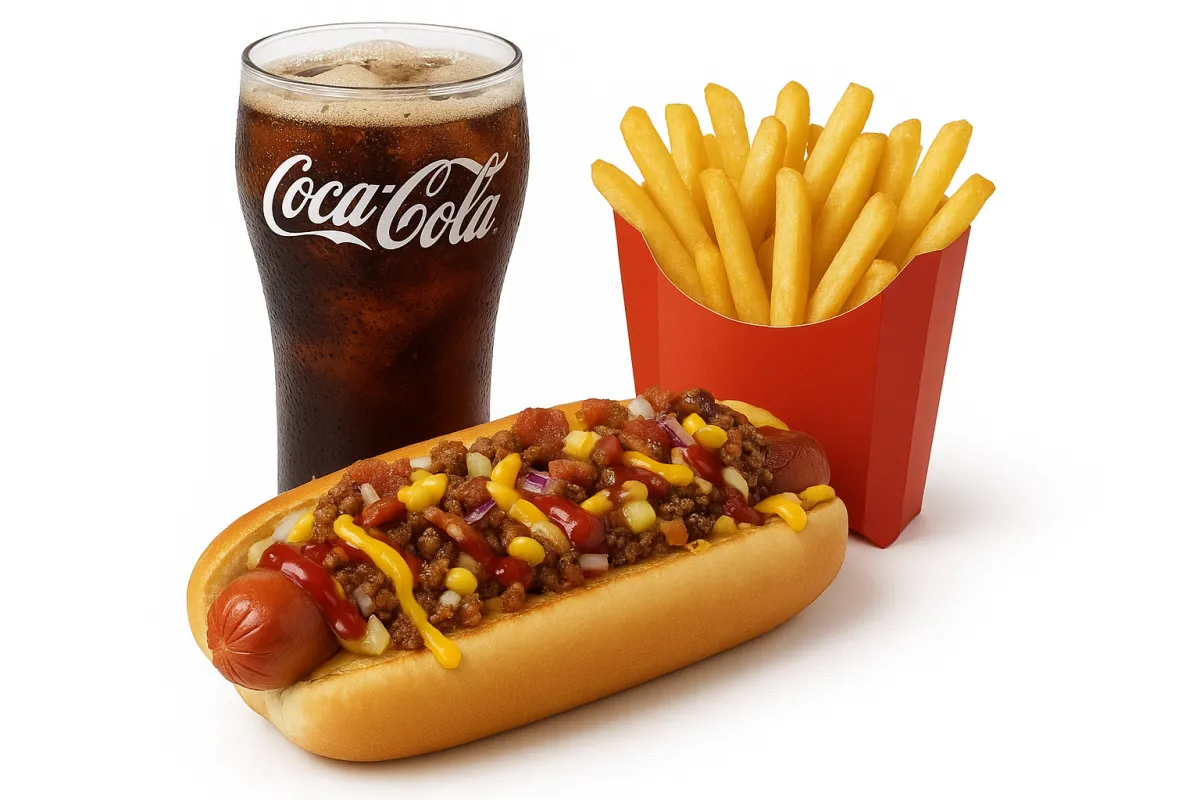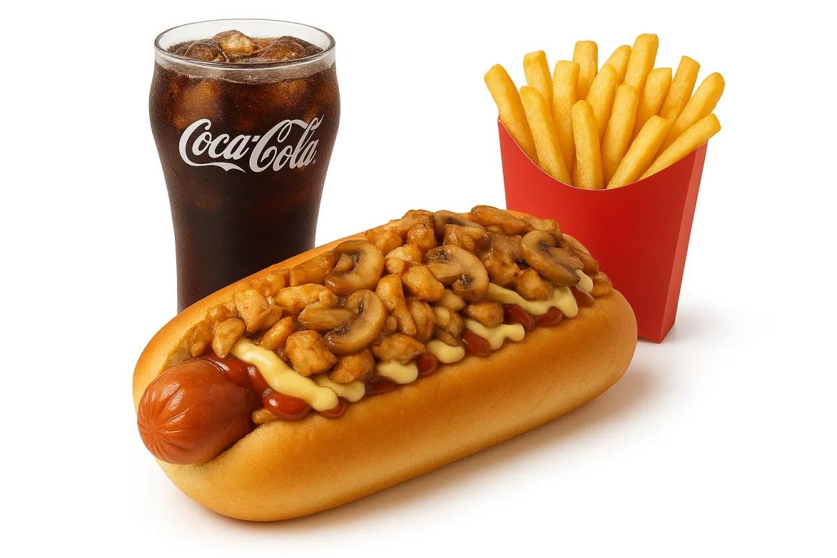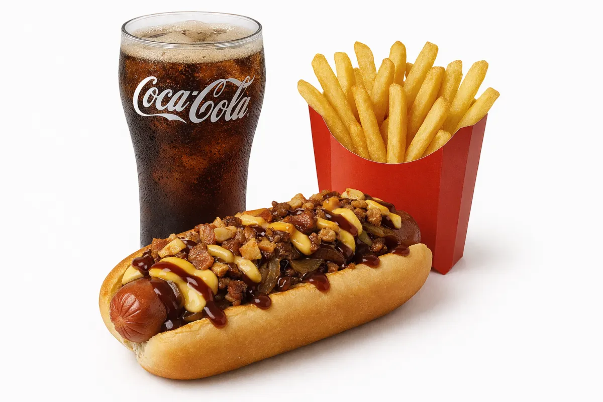 Salchicha americana, cebolla caramelizada, tocineta, recorte de papa, queso y salsas