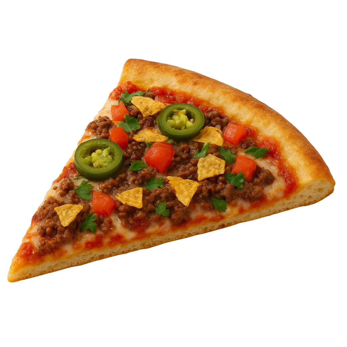 Pizza con Tomate, cilantro, carne, jalapeños, tostacos y queso.