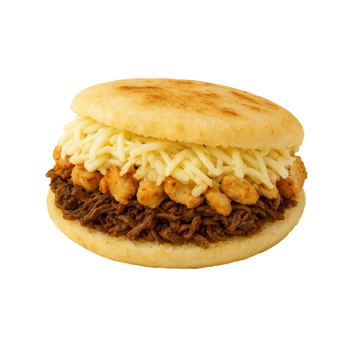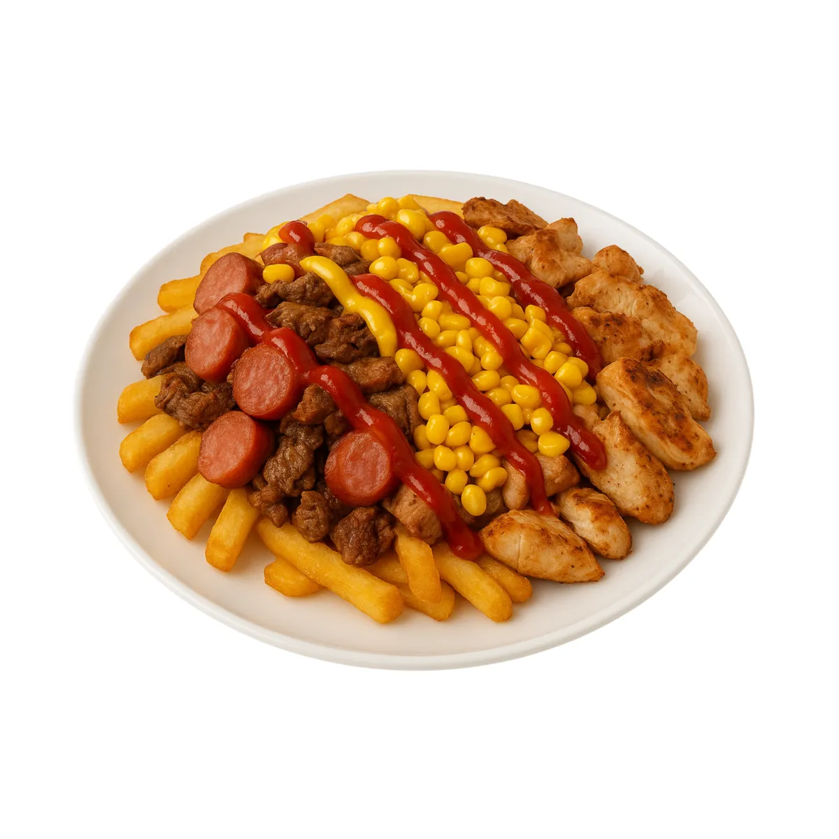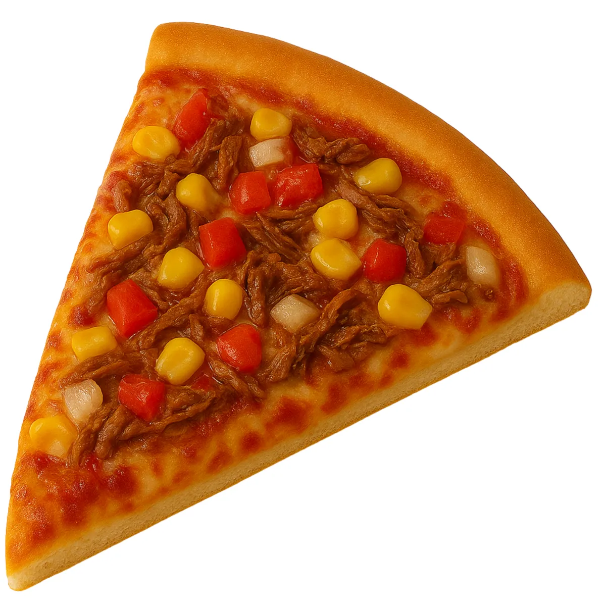 Pizza con Maíz, carne desmechada, tomate, pimentón y cebolla